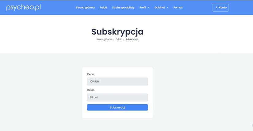 Wejdź na stronę https://psycheo.pl i zaloguj się na swoje konto Specjalisty. Następnie przejdź Konto -> Subskrypcja - Zmień typ konta na subskrypcyjne.