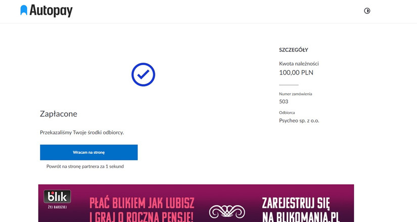 Po pomyślnym zakończeniu płatności zobaczysz komunikat „Zapłacone” oraz potwierdzenie przekazania środków.