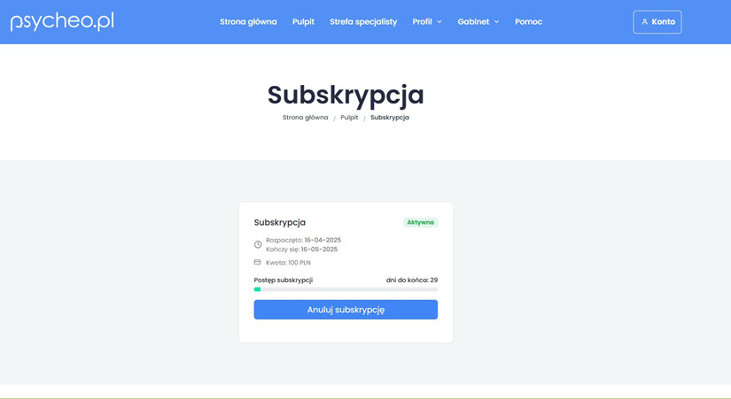 Po powrocie na portal psycheo.pl zostaniesz przeniesiony do zakładki 'Subskrypcja', gdzie zobaczysz, że subskrypcja została aktywowana – z datą rozpoczęcia, zakończenia oraz liczbą dni do końca.