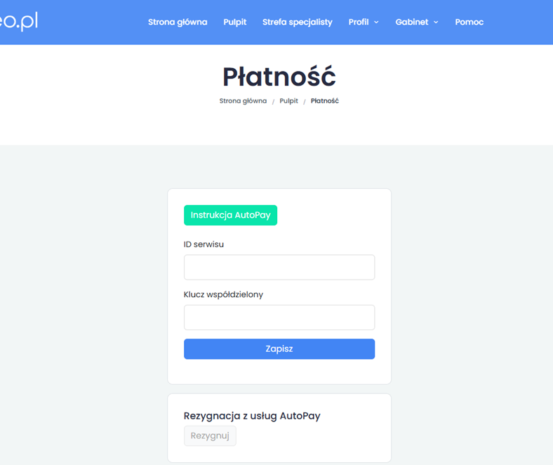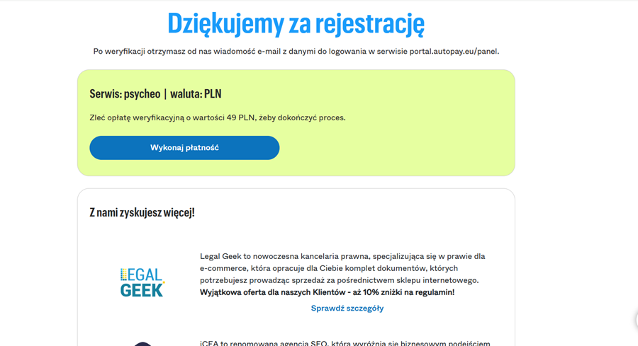 Proces rejstracji musi zostać wykonany przez poniższy link, ponieważ link posiada określoną wartość prowizyjną dla wszystkich specjalistów na portalu Psycheo.pl. Wystarczy, że za jego pomocą zarejestrujesz się, a wartość prowizji (1,19% brutto) dla Autopay zostanie automatycznie przypisana. Autopay pobiera jednorazową opłatę za aktywowanie usługi (49 zł brutto)