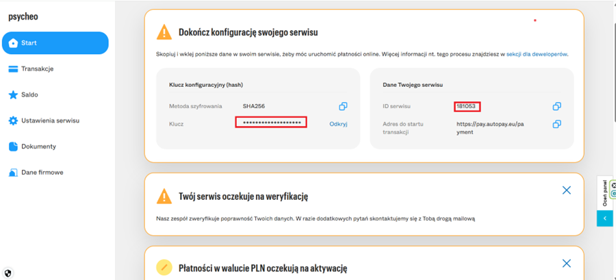 Krok 20: Zaloguj się do panelu – zobaczysz dane integracyjne serwisu.