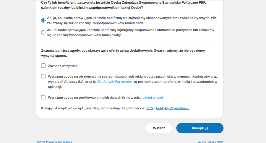 Krok 14: Potwierdź brak powiązania z osobami na stanowiskach politycznych i zaznacz zgody.