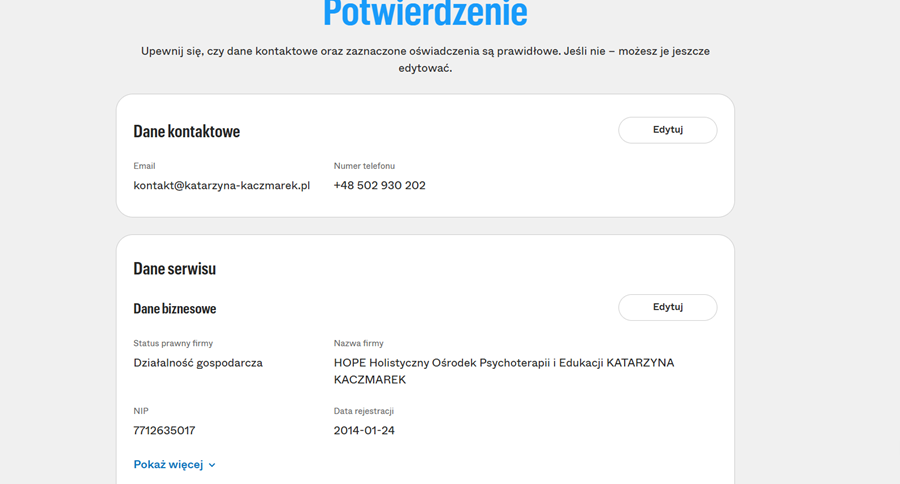 Krok 11: Sprawdź wszystkie dane kontaktowe i firmowe przed finalizacją.