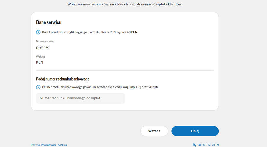 Krok 9: Wprowadź numer rachunku bankowego (zostanie pobrana opłata weryfikacyjna 49 PLN).