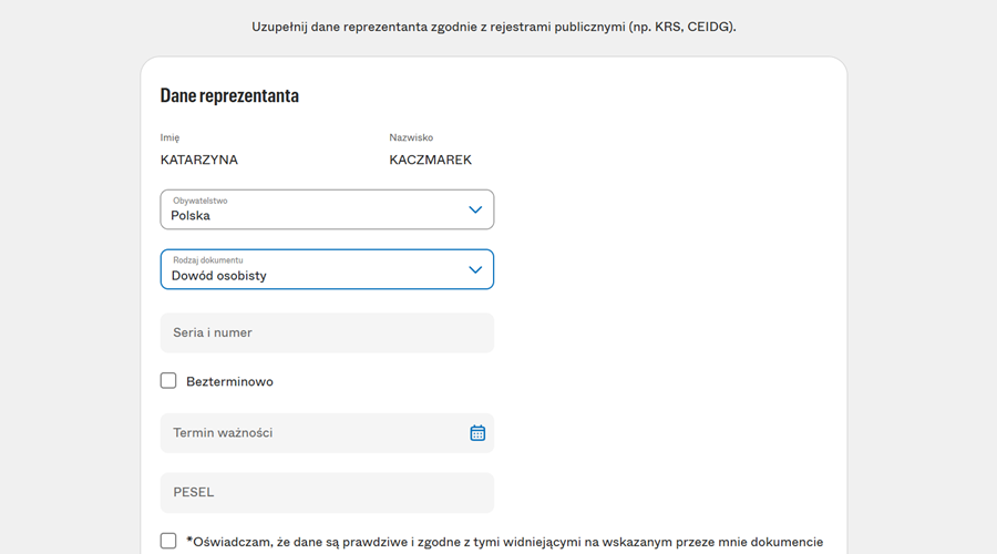 Krok 6: Uzupełnij dane reprezentanta – imię, nazwisko, dokument tożsamości.