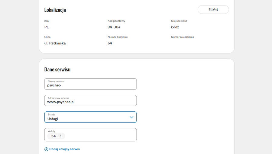 Krok 4: Wprowadź dane serwisu – nazwa, adres strony, branża, waluta.
