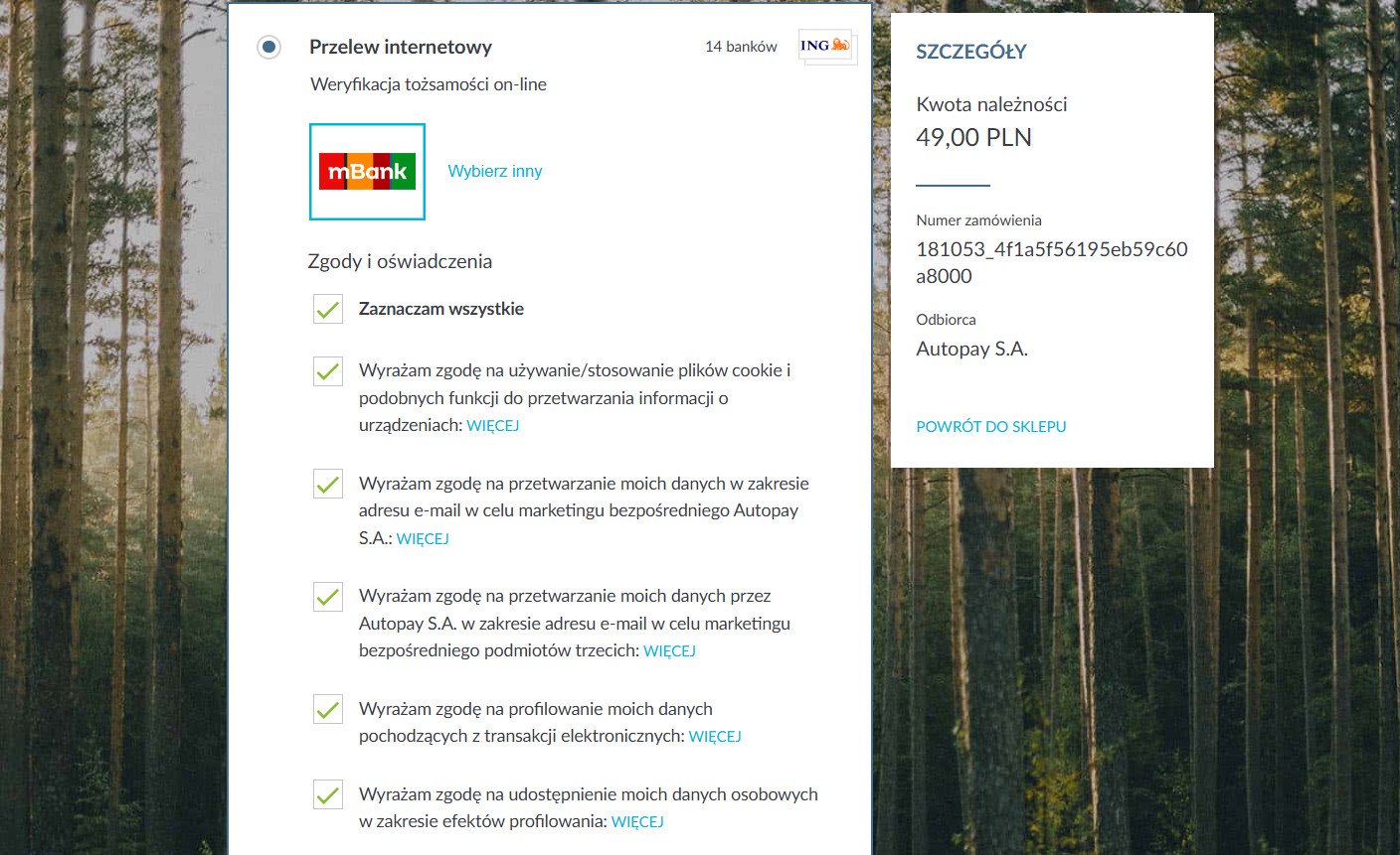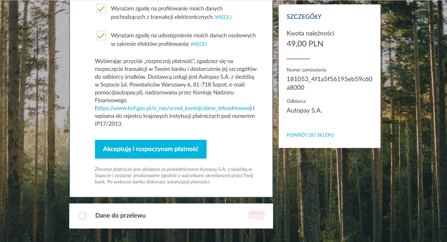 Krok 17: Wybierz bank, zaznacz zgody i kliknij „Akceptuję i rozpoczynam płatność”. Wykonaj przelew