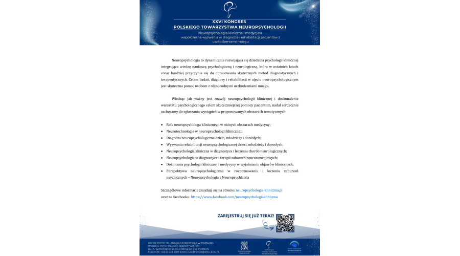 Z przyjemnością informujemy, że Psycheo objęło swoim patronatem kolejne ważne wydarzenie: XXVI Kongres Polskiego Towarzystwa Neuropsychologicznego: „Neuropsychologia kliniczna i medycyna – współczesne wyzwania w diagnozie i rehabilitacji pacjentów z uszkodzeniami mózgu”.